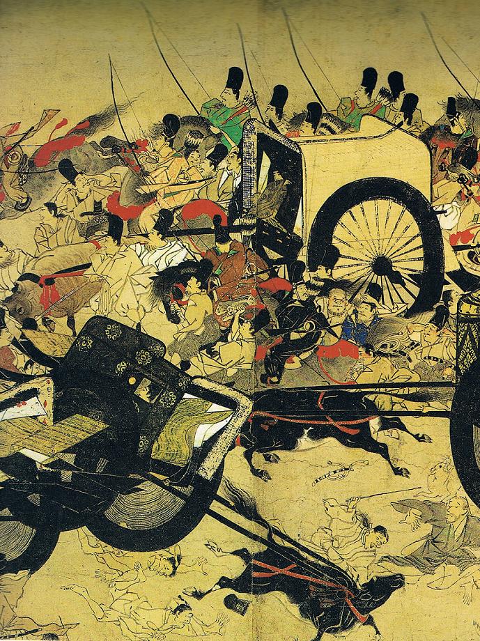 左の絵は、13世紀に描かれた平治物語絵巻の一巻、三条殿夜討巻の一部である。一部しかお見せ出来ないのは残念であるが、牛車が暴走し車輪が回転する様はどうであろうか、描かれている人物の表情、人馬の躍動感、ダイナミックな臨場感、まるで現代コミックやアニメの一画面のようである。否、人物の表情などは形式化された現代アニメより豊かである。