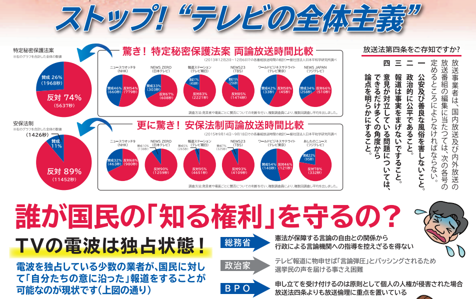 放送法が有る限り、NHKに認められた表現の自由は、放送法4条の範囲内でしか無いのである。一般国民が、どのような思想を持とうと、自分が神であると言おうと、地球が三角だと言おうと、それは自由である。しかしNHKに一般国民と同じ表現の自由など無い。だから受信料契約が有るのではないか。つまり放送法4条は受信料契約を結ぶときの契約条件であり、従って偏向報道は許されず、偏向報道した場合は契約破棄(否、違約金を払えと言う事になる)となる筈である。それと同時にNHKの存在も認められなくなる。